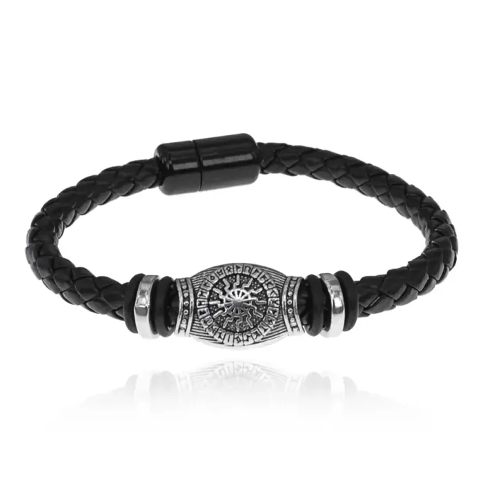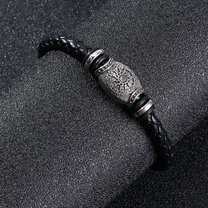 Кожаный браслет с металлическим декоративным элементом в виде солнца.