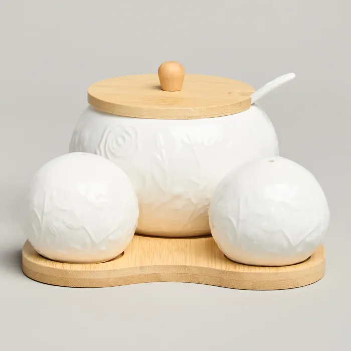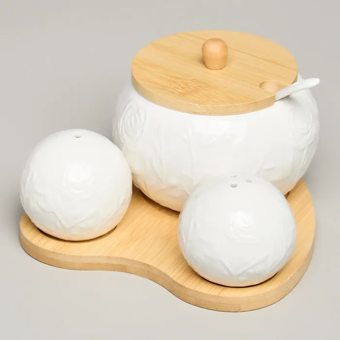 - Материал: фарфор, бамбук, дерево- Количество предметов в наборе: 3- Размер подставки: 15.5 х 15.5 х 10 см- Совместимость: СВЧ, ПММ- Особенности ухода: бамбуковые элементы требуют бережного обращения и протирки насухо