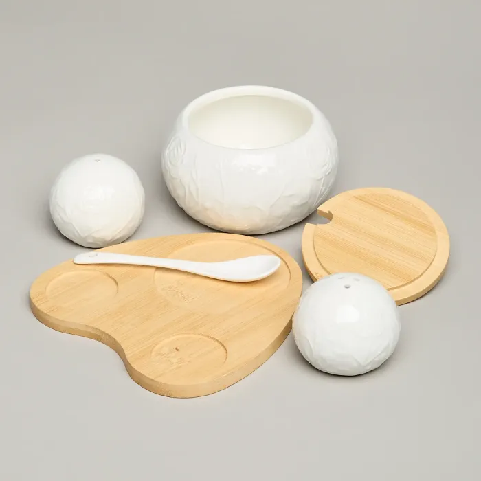 Основной материал — фарфор, обеспечивающий гигиеничность и безопасность при контакте с пищевыми продуктами. Бамбуковые элементы служат декоративным и функциональным дополнением. Подставка из дерева объединяет предметы в единую композицию.