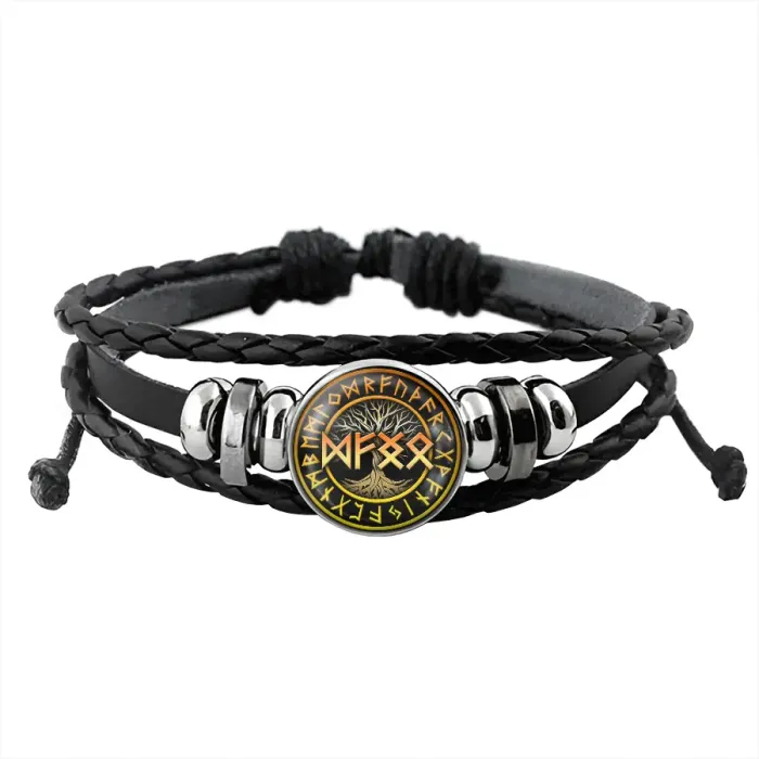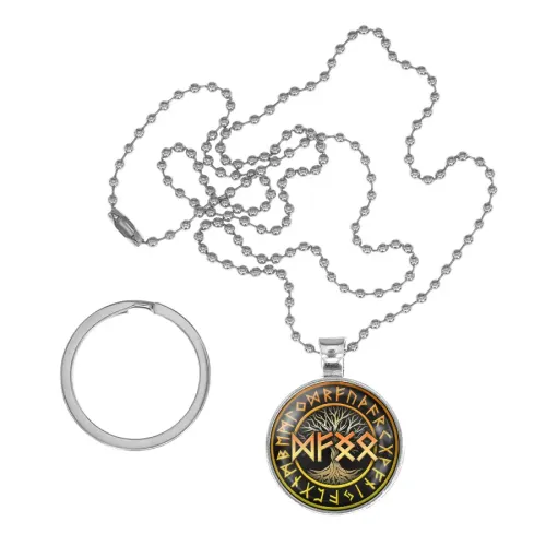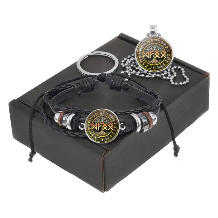 Сувенирный набор, включающий браслет и кулон-брелок с изображениями рун. Основные элементы выполнены из кожи и бижутерного сплава.