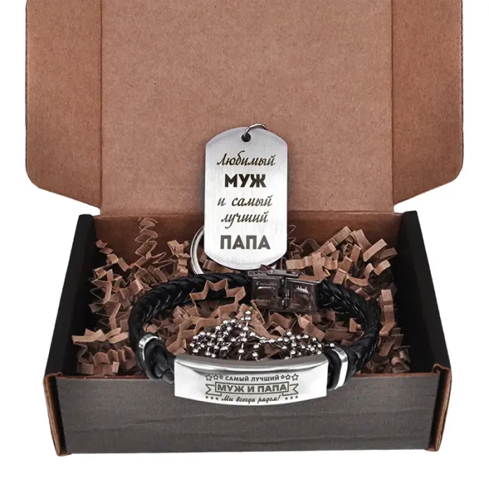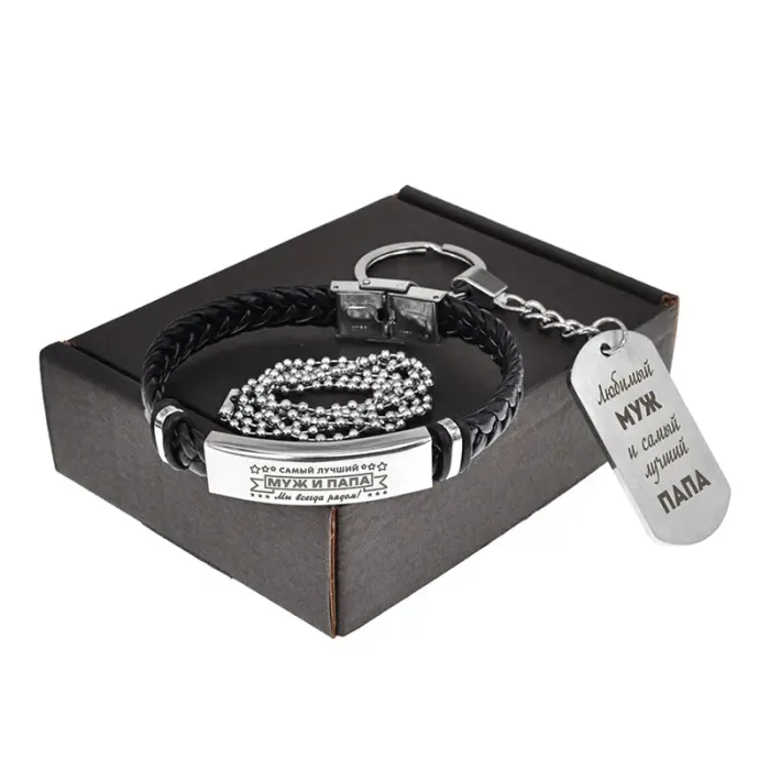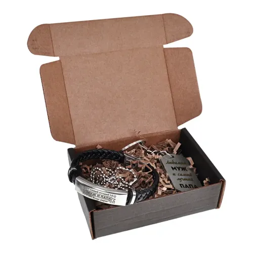 Подарочный набор, состоящий из браслета и жетона. Материалы: экокожа, нержавеющая сталь.