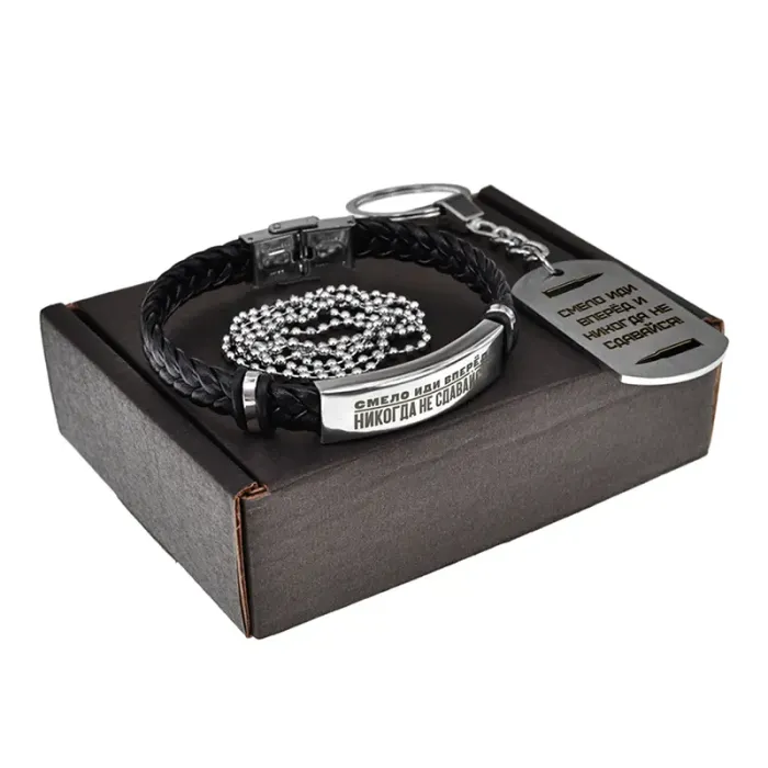 Подарочный набор, состоящий из кожаного браслета и жетона с гравировкой.