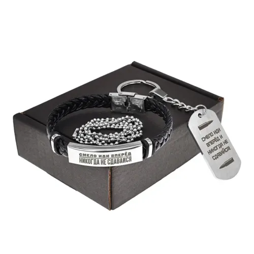Размеры и комплектация: Браслет: длина 20,5 см, ширина 1 см, внутренний диаметр 6 см. Жетон: 4,9x2,8 см. В набор входит кольцо для ключей и шариковая цепочка. Упакован в картонную коробку 11,2x8,3x3 см с крафт-наполнителем.
