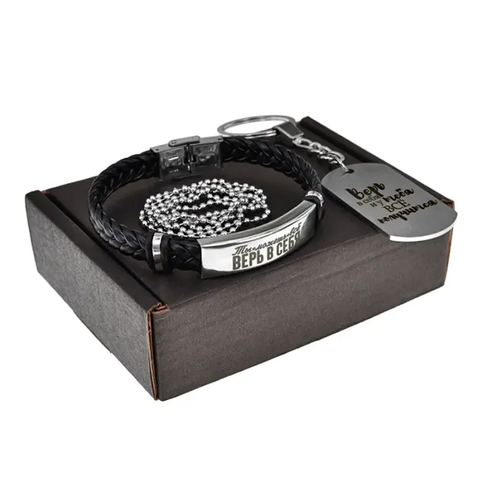 Подарочный набор 'Ты можешь всё, верь в себя' включает стильный кожаный браслет и изысканный жетон с гравировкой. Этот набор символизирует уверенность и вдохновение, что делает его идеальным подарком для близких.