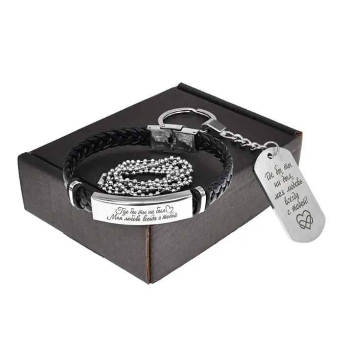 Подарочный набор, состоящий из кожаного браслета и жетона с гравировкой.