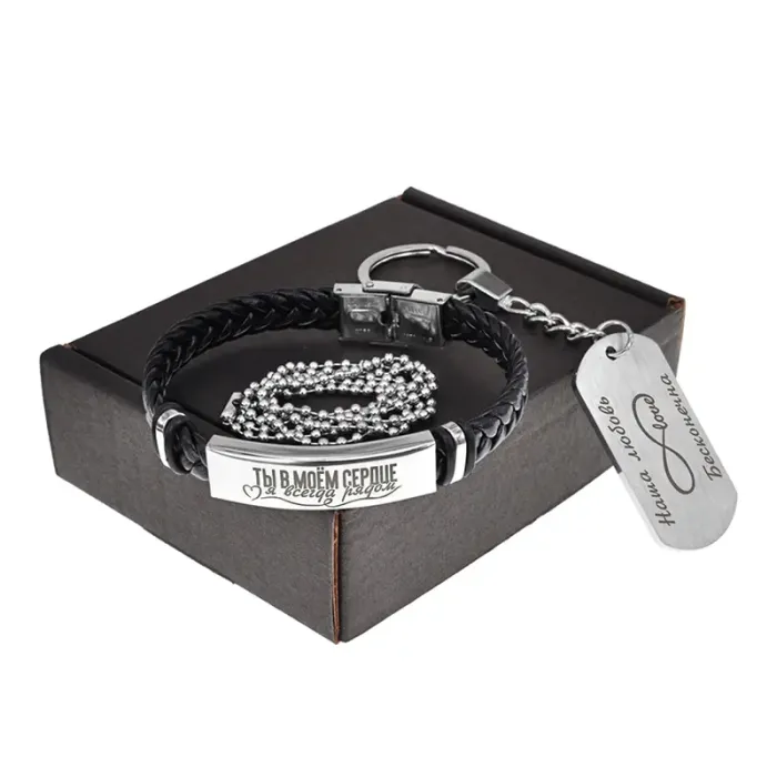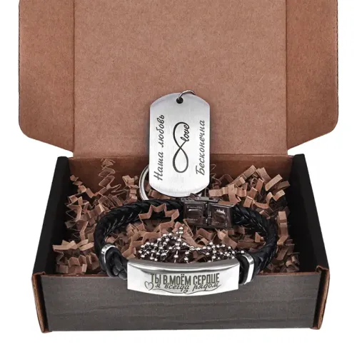 Подарочный набор, состоящий из кожаного браслета и металлического жетона с гравировкой, в картонной коробке.