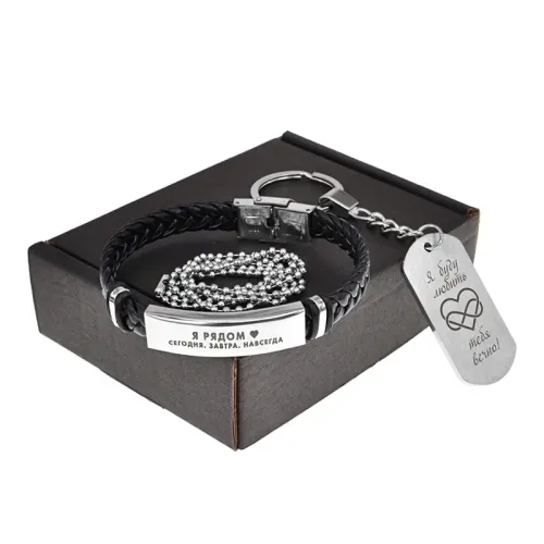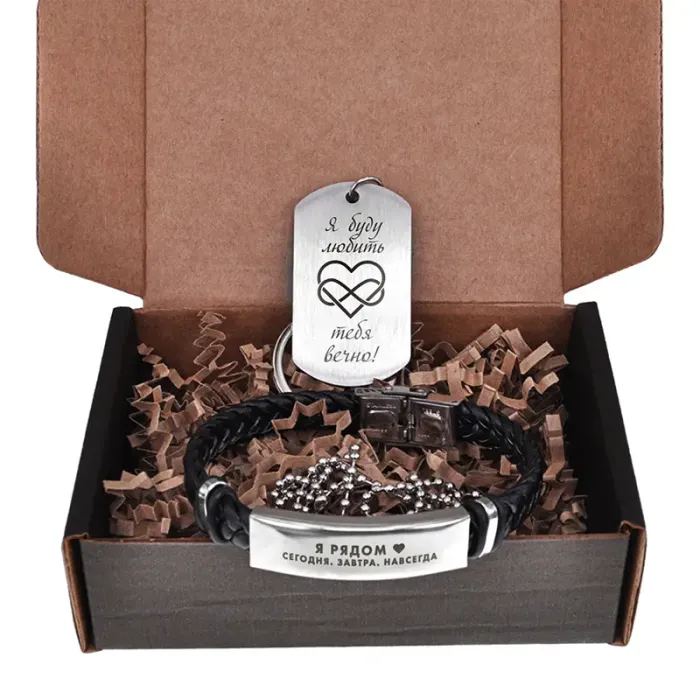 Подарочный набор включает кожаный браслет и металлический жетон с гравировкой.