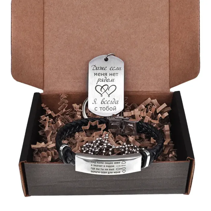 Подарочный набор, состоящий из браслета и жетона. Материалы: экокожа, нержавеющая сталь.