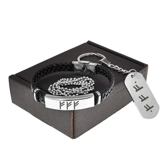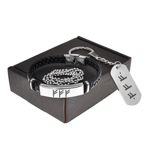 Сувенирный набор, включающий браслет и жетон с рунической символикой. Материалы: экокожа, нержавеющая сталь.