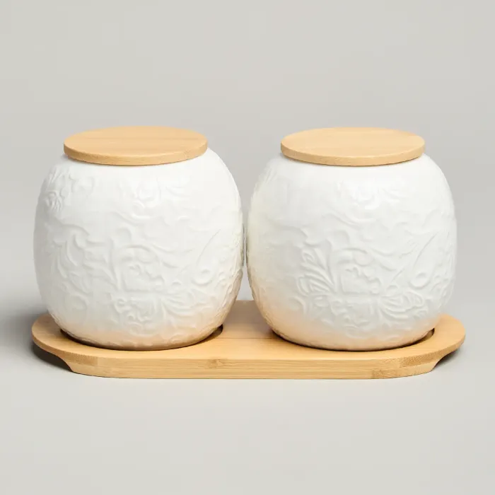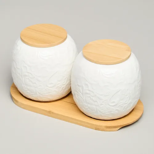 - Материал: фарфор, дерево (бамбук)- Размеры одной банки: 19.5 х 9.5 см- Объём одной банки: 400 мл- Количество предметов в наборе: 2 банки с крышками, 1 деревянная подставка- Совместимость: банки можно мыть в посудомоечной машине- Особенности ухода: деревянные детали требуют ручной сушки после очистки