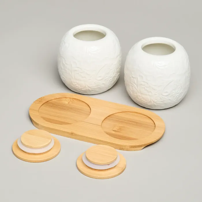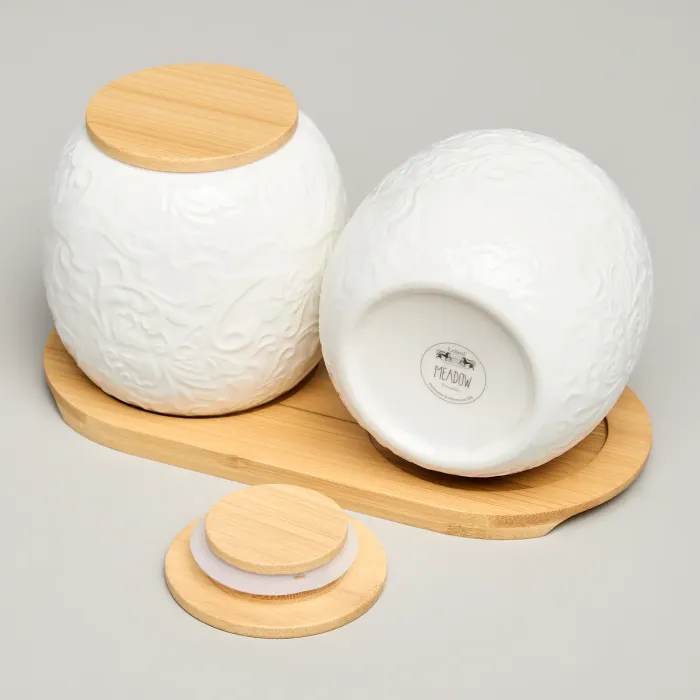 Для сохранения внешнего вида деревянных элементов их рекомендуется протирать сухой тканью. Набор подходит для организации пространства на кухонной полке или столешнице. Белый фарфор и натуральное дерево позволяют сочетать эти банки с посудой в скандинавском, эко- или современном стиле интерьера.