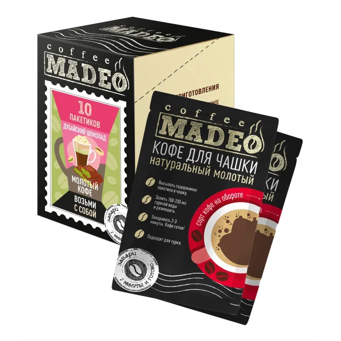 Десертный молотый кофе Madeo «Дубайский шоколад» представлен в удобных порционных пакетиках. Он создан на основе арабики из стран Латинской Америки и сочетает сладкие ноты молочного шоколада, фисташки, сливок и карамели с лёгкими пряными акцентами.