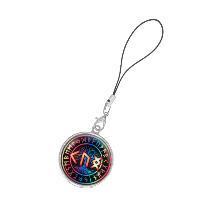 Подвеска-брелок для телефона из бижутерного сплава под серебро с изображением под выпуклой стеклянной линзой.