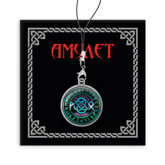 Назначение и особенности: Сувенирная подвеска для телефона. Дизайн включает кельтский узел и рунические символы.