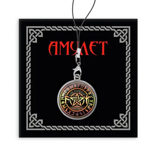 Назначение и особенности: Сувенирный декор для телефона. Кулон украшен символами пентаграммы и рун.