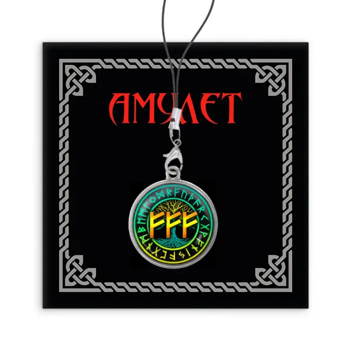 Назначение и особенности: Сувенирный аксессуар для телефона. На изображении использована формула «Материальное благополучие» с рунами Феху.