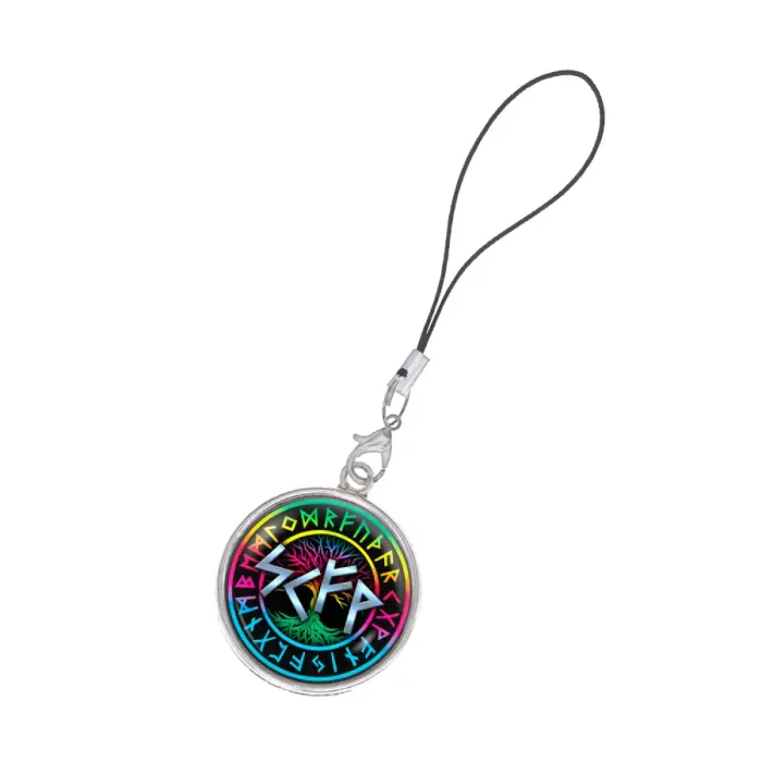Подвеска-брелок из бижутерного сплава под серебро для телефона. Кулон диаметром 22 мм с изображением под выпуклой стеклянной линзой диаметром 20 мм.