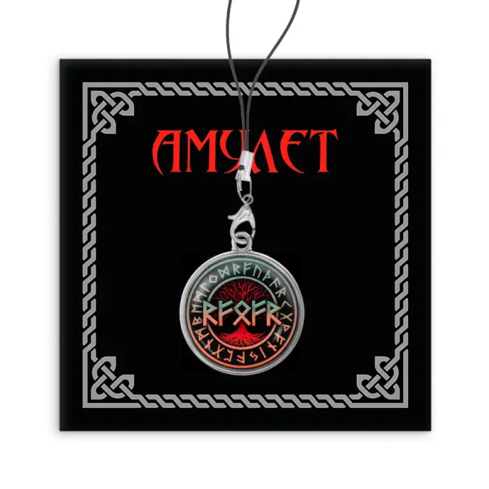 Назначение и особенности: Сувенирный аксессуар для телефона. Дизайн включает руны Райдо, Феху и Одал.