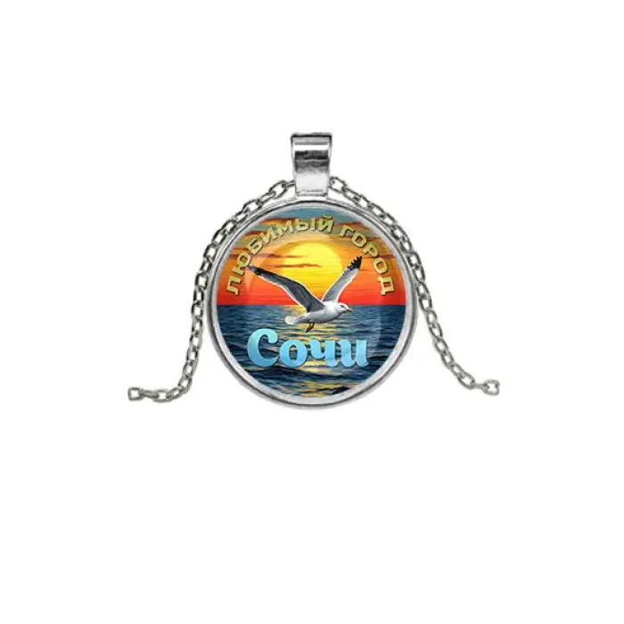 Кулон с цепочкой из бижутерного сплава с изображением города под стеклянной линзой.