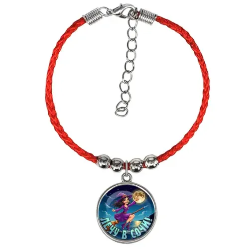 Браслет из красного шнура с металлической основой и круглым изображением под выпуклым стеклом.