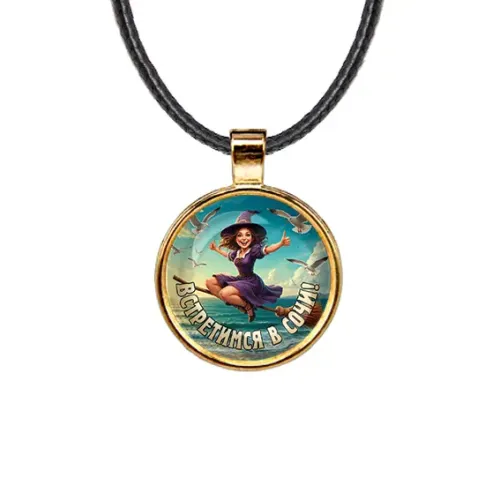 Кулон с изображением и надписью «Встретимся в Сочи». Изготовлен из бижутерного сплава с золотым покрытием и стеклянной линзой.