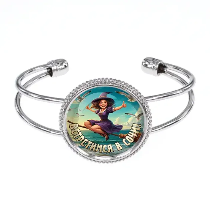 Браслет из бижутерного сплава с символическим изображением под защитной стеклянной линзой.