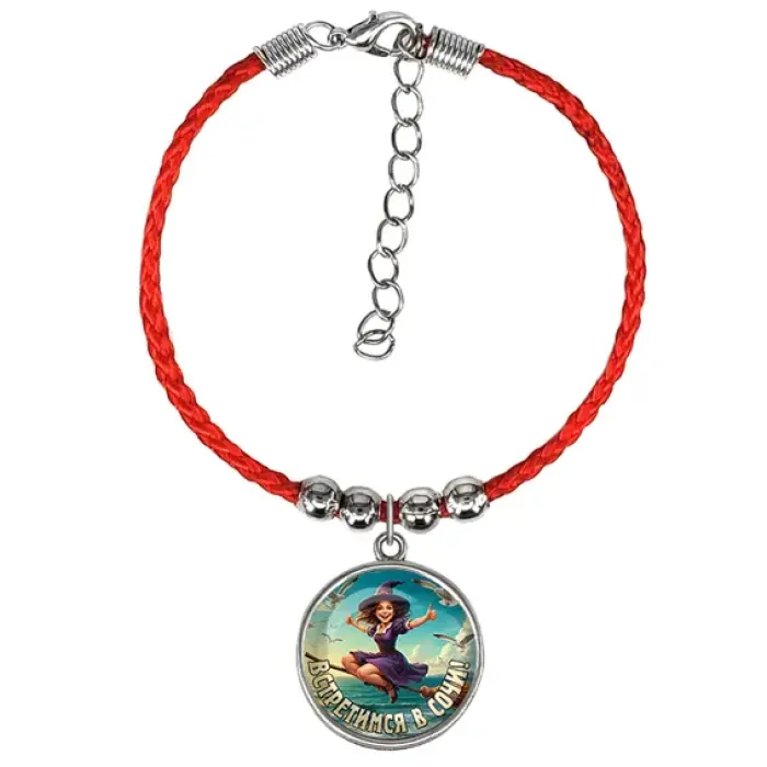 Браслет из красного шнура с металлической основой и круглым изображением под выпуклым стеклом.