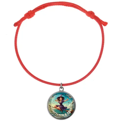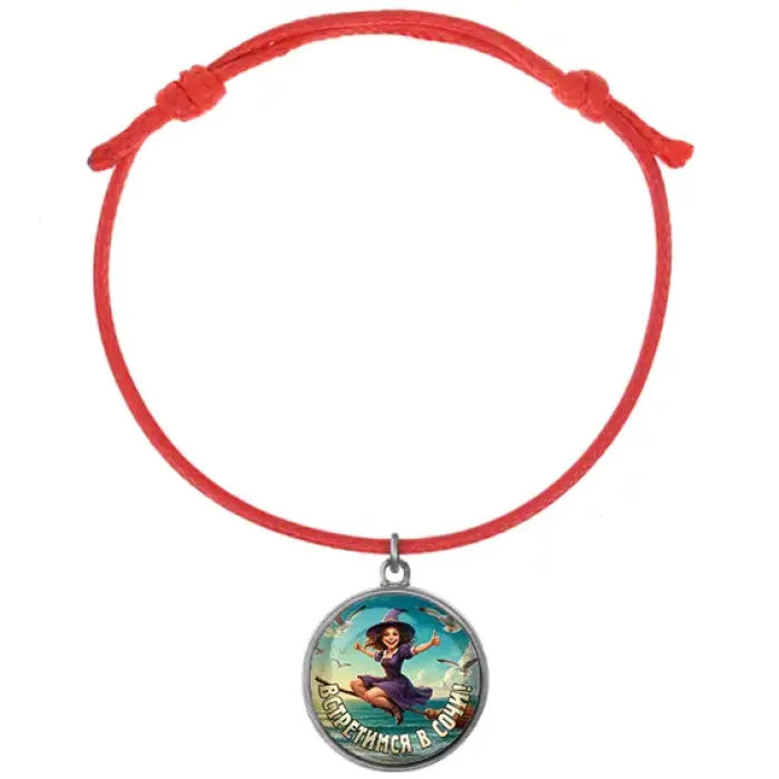 Браслет из красного шнура с металлической подвеской. Подвеска имеет полиграфическую вставку под выпуклым стеклом.