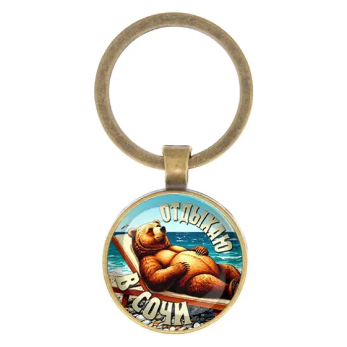 Круглый брелок с изображением на тему отдыха в Сочи. Материал — бижутерный сплав с бронзовым покрытием и стеклянной линзой.