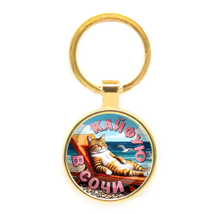 Круглый брелок «Кайфую в Сочи» — это стильный аксессуар, который станет отличным подарком или сувениром. Он выполнен из бижутерного сплава с покрытием под золото и стекла, что придаёт ему элегантный вид. Размер с кольцом составляет 28х60 мм, а изображение защищено выпуклой стеклянной линзой, что обеспечивает долговечность и яркость цветов.