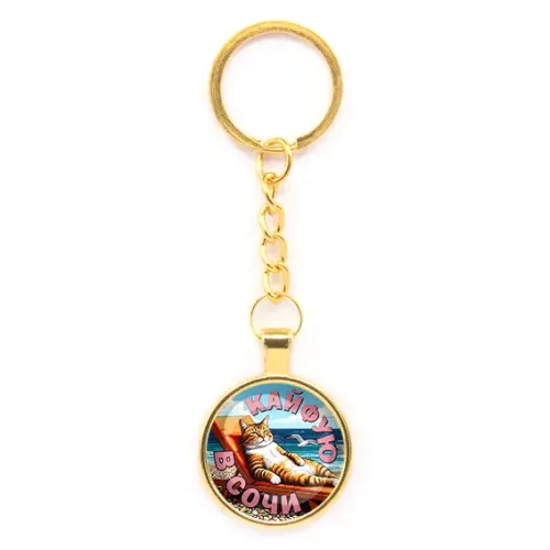 Круглый брелок «Кайфую в Сочи» — это стильный аксессуар, который станет отличным подарком и символом ярких моментов на Черноморском побережье. Изготовленный из бижутерного сплава с покрытием под золото и стекла, он сочетает элегантность и практичность.