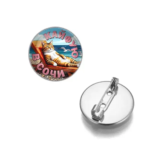 Круглый значок «Кайфую в Сочи» — сувенирный аксессуар из бижутерного сплава с серебристым покрытием и стеклянной линзой.