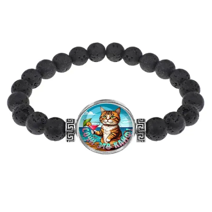 Стрейч-браслет из натуральной лавы диаметром 8 мм с изображением под выпуклой стеклянной линзой. Внутренний диаметр составляет около 5,5 см. Изготовлен из лавы, бижутерного сплава с покрытием под серебро и стекла. Лава известна своей способностью впитывать эфирные масла, что делает этот браслет идеальным для аромабижутерии. Достаточно нанести несколько капель эфирного масла на бусины, чтобы насладиться ароматом в течение дня. Возможность сочетать разные ароматы позволяет создавать уникальные композиции и наслаждаться индивидуальным стилем.