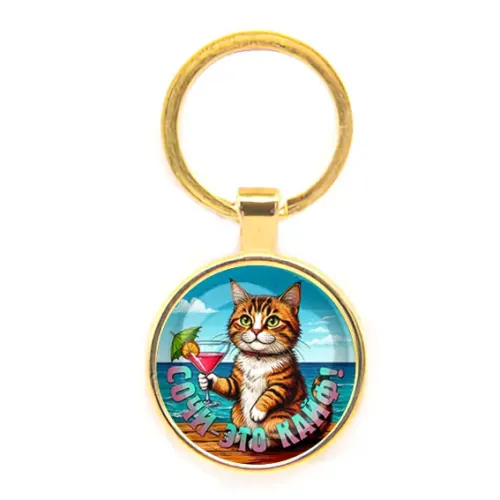 Круглый брелок с изображением «Сочи - это кайф» станет отличным сувениром и символом солнечного курорта. Изготовленный из бижутерного сплава с покрытием под золото и стеклом, он сочетает в себе стильный дизайн и прочность. Размеры брелка составляют 28х60 мм, а изображение защищено выпуклой стеклянной линзой, что придаёт ему особую выразительность. Этот аксессуар не только украсит ключи или сумку, но и напомнит о незабываемых моментах отдыха на Черноморском побережье.