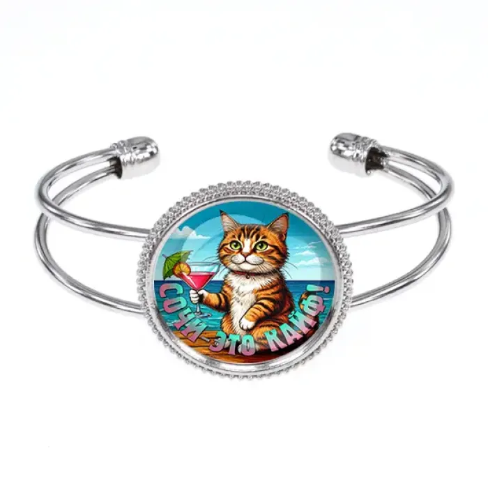 Браслет металлический из бижутерного сплава — стильный аксессуар с уникальным дизайном. Изображение диаметром 25 мм под выпуклой стеклянной линзой придаёт изделию особую выразительность. Безразмерная форма позволяет носить браслет на любой запястье, а покрытие под серебро добавляет элегантности и шика. Этот браслет станет отличным подарком или самовыражением для тех, кто ценит оригинальные украшения. Вдохновлённый атмосферой Сочи, он отражает яркие эмоции и позитивные моменты жизни.
