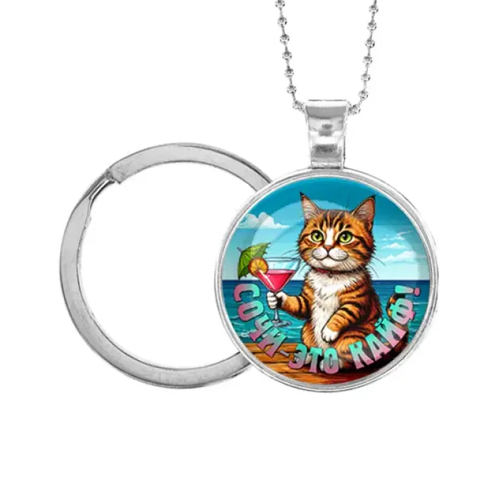 Кулон-брелок «Сочи - это кайф» из бижутерного сплава с покрытием под серебро и стеклянной линзой.