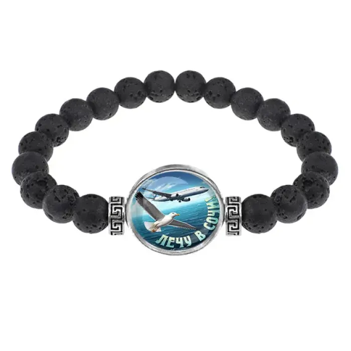 Стрейч-браслет из натуральной лавы с изображением под выпуклой стеклянной линзой.