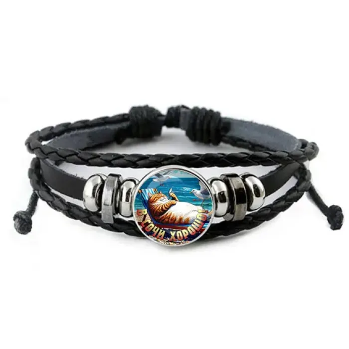 Кожаный браслет с декоративным элементом под стеклянной линзой.