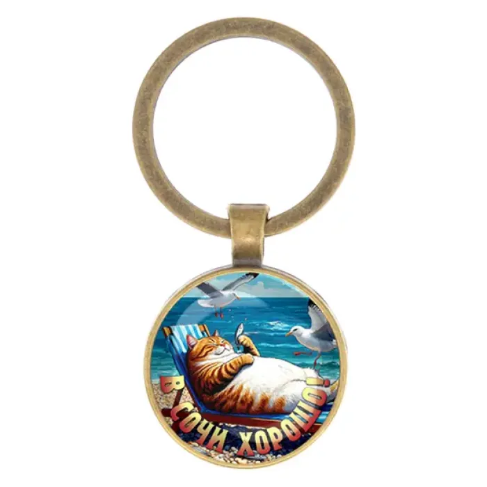 Круглый брелок из бижутерного сплава с изображением «В Сочи хорошо» и выпуклой стеклянной линзой.