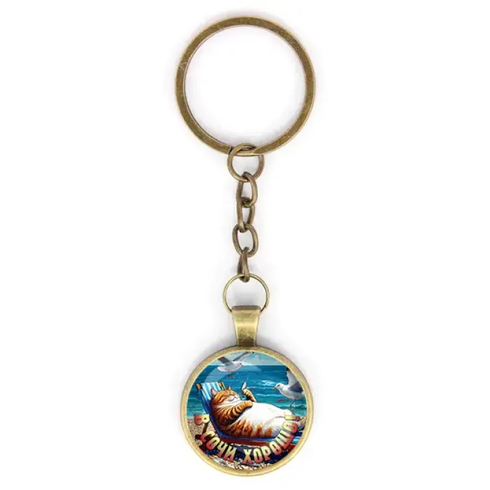Брелок сувенирный круглой формы с изображением и надписью «В Сочи хорошо», выполнен из металлического сплава с бронзовым покрытием и стеклянной линзой.