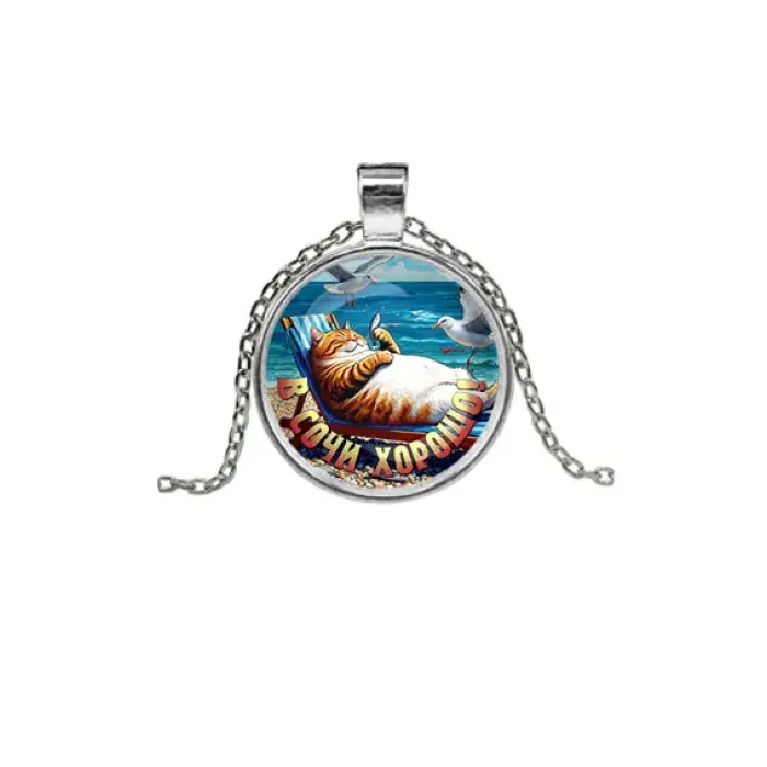 Сувенирный кулон с изображением и цепочкой. Материал — бижутерный сплав с серебристым покрытием и стеклянным элементом.