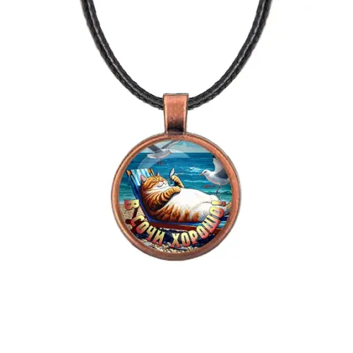 Сувенирный кулон в цвете меди со шнурком и стеклянным элементом.
