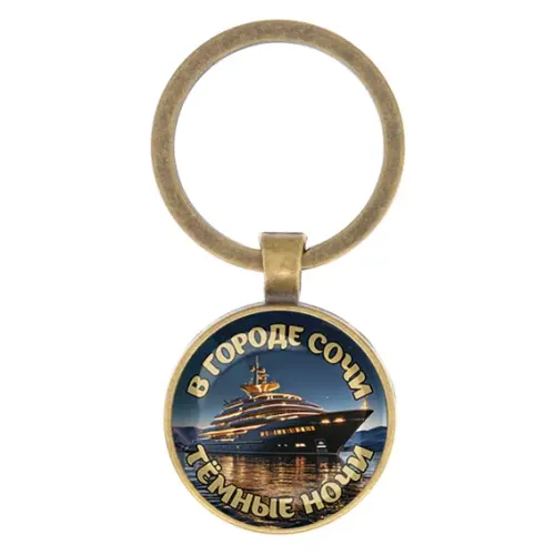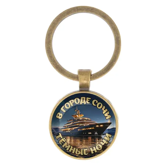 Брелок круглой формы в цвете бронза с изображением города Сочи. Изготовлен из бижутерного сплава и стекла.