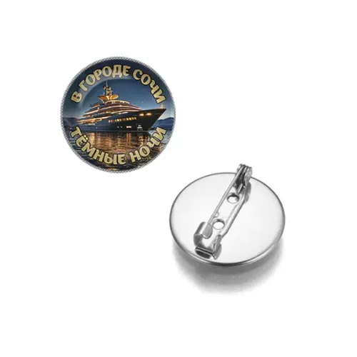 Круглый значок «В городе Сочи» — сувенирный аксессуар из бижутерного сплава с серебристым покрытием и стеклянной линзой.