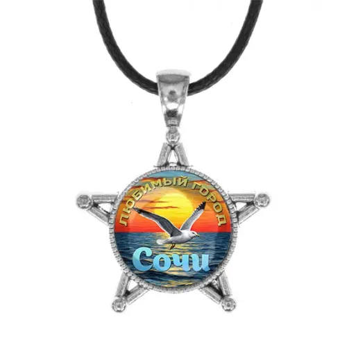 Сувенирный кулон в форме звезды с изображением города. Материал: бижутерный сплав под серебро и стекло.