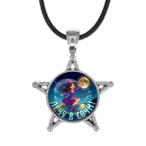Сувенирный кулон в виде звезды с изображением «Лечу в Сочи». Материал — бижутерный сплав под серебро и стекло.