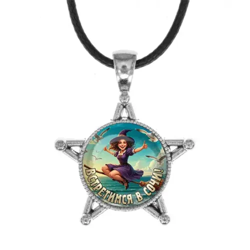 Кулон в виде звезды с изображением Сочи. Изготовлен из бижутерного сплава под серебро со стеклянными элементами.