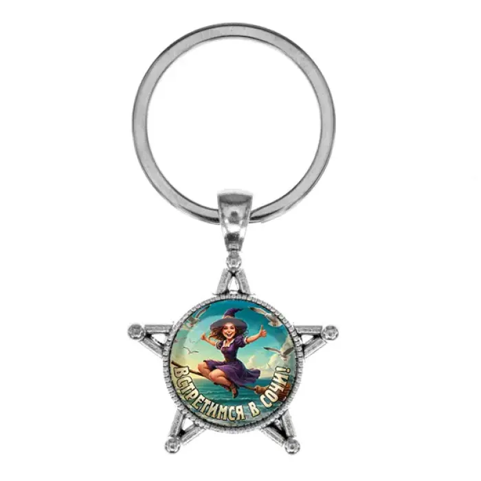 Брелок в виде звезды из бижутерного сплава под серебро с изображением, защищённым стеклянной линзой.