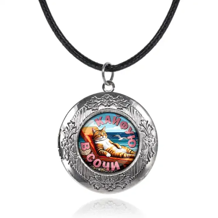 Арома-кулон металлический Кайфую в Сочи — это стильный аксессуар, который не только дополнит образ, но и создаст атмосферу уюта благодаря возможности использования ароматических масел. Изготовлен из бижутерного сплава под серебро, что придаёт изделию элегантный вид. Размер кулона составляет 36х33 мм, что делает его компактным и удобным для ношения. Укомплектован шнурком с застёжкой для комфортного использования. Внутри находится впитывающий шарик, который позволяет долго сохранять аромат. Под выпуклой стеклянной линзой диаметром 20 мм размещено красивое изображение, добавляющее индивидуальности. Для достижения наилучшего эффекта рекомендуется капнуть несколько капель любимого эфирного масла на впитывающий шарик. Кулон идеально подходит как для повседневной носки, так и для особых случаев. Он станет отличным подарком или элементом декора для создания уютной атмосферы.