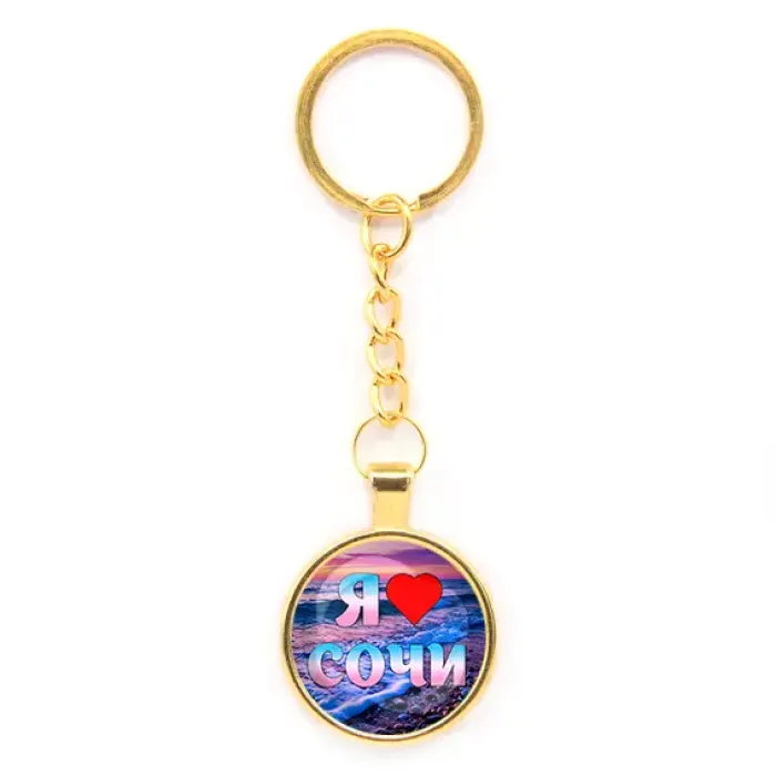 Круглый брелок «Я люблю Сочи» из бижутерного сплава с золотым покрытием и стеклянной линзой.